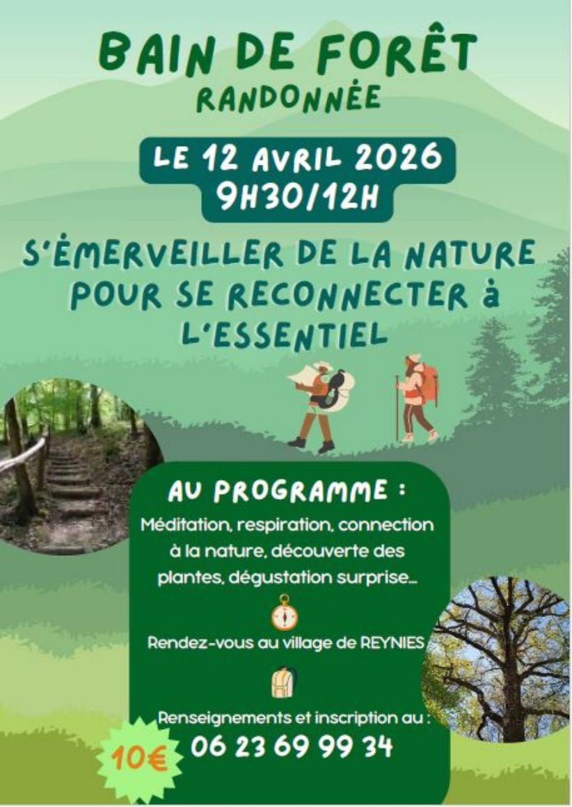 Bain de forêt sur les hauteurs de Reyniès (82370) Contact au : 0623699934. 16 personnes maximum. Participation à partir de 10€. Sous réserve de beau temps.